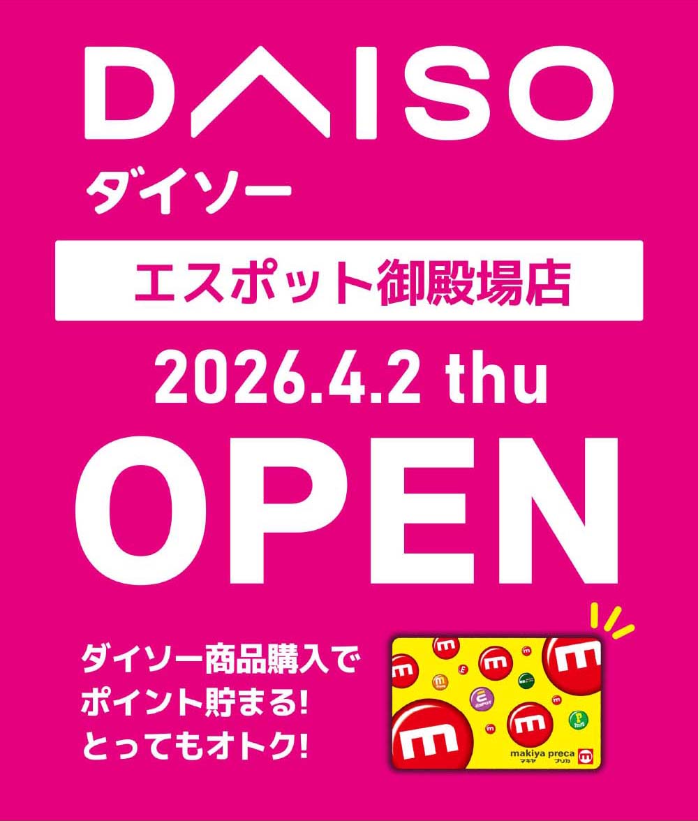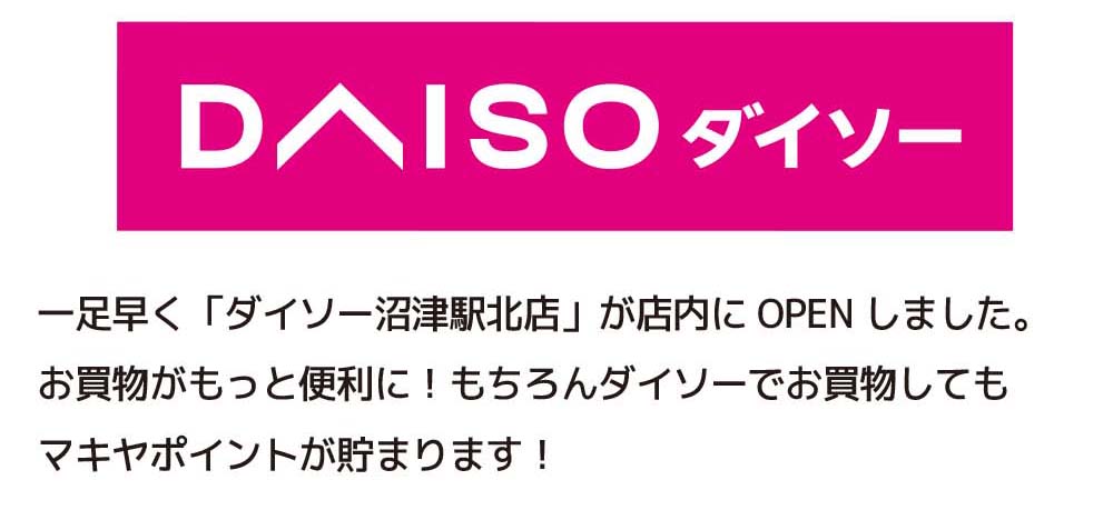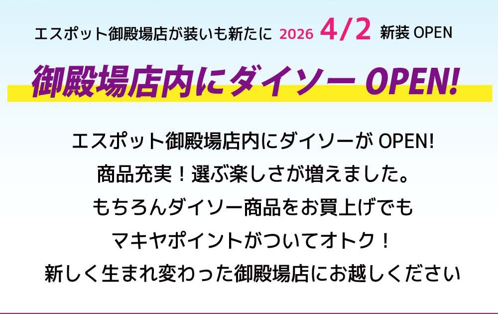 4月2日(木)エスポット御殿場店内にダイソーOPENいたします!商品さらに充実!お買物がもっと楽しく便利に。もちろんダイソー商品お買上げでもマキヤポイントが貯まります。ぜひお越しください。