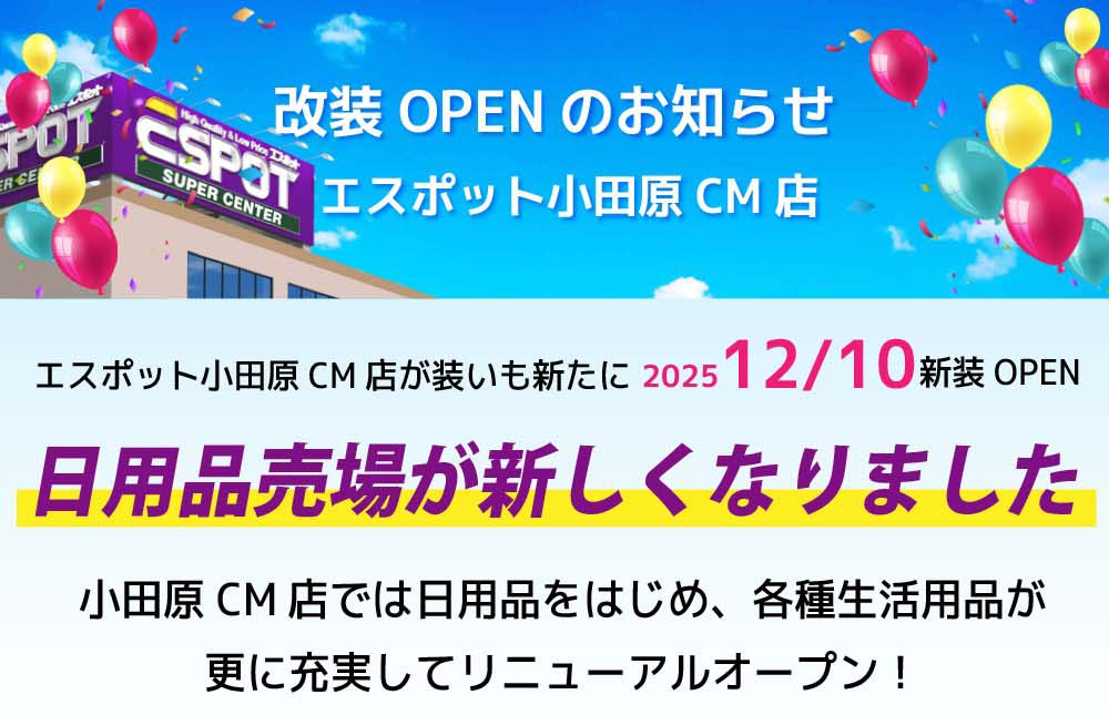 小田原CM店は日用品をさらに充実させてリニューアルOPENいたしました。