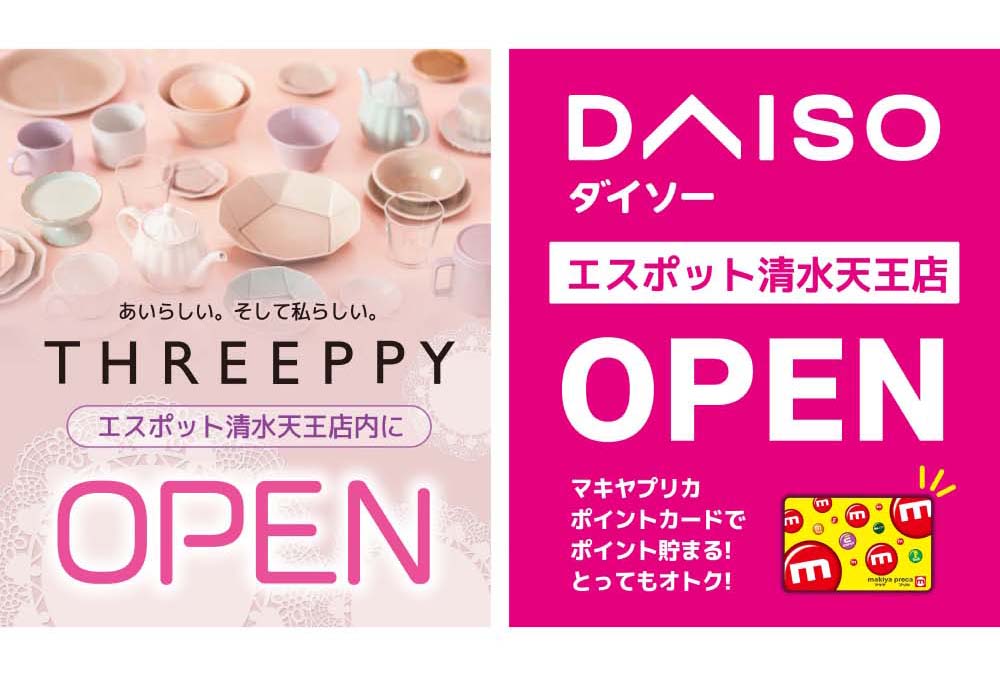 お待たせしました、3月1日(日)エスポット清水天王店内にダイソーとThreeppyが同時OPENいたします!お買物がもっと楽しく便利に。マキヤポイントも貯まってとってもオトクです!ぜひお越しください。