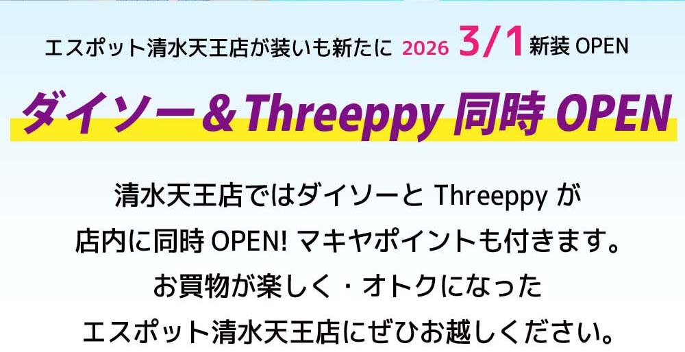 2026年3月1日(日)エスポット清水天王店「ダイソー&THREEPPY」同時OPEN