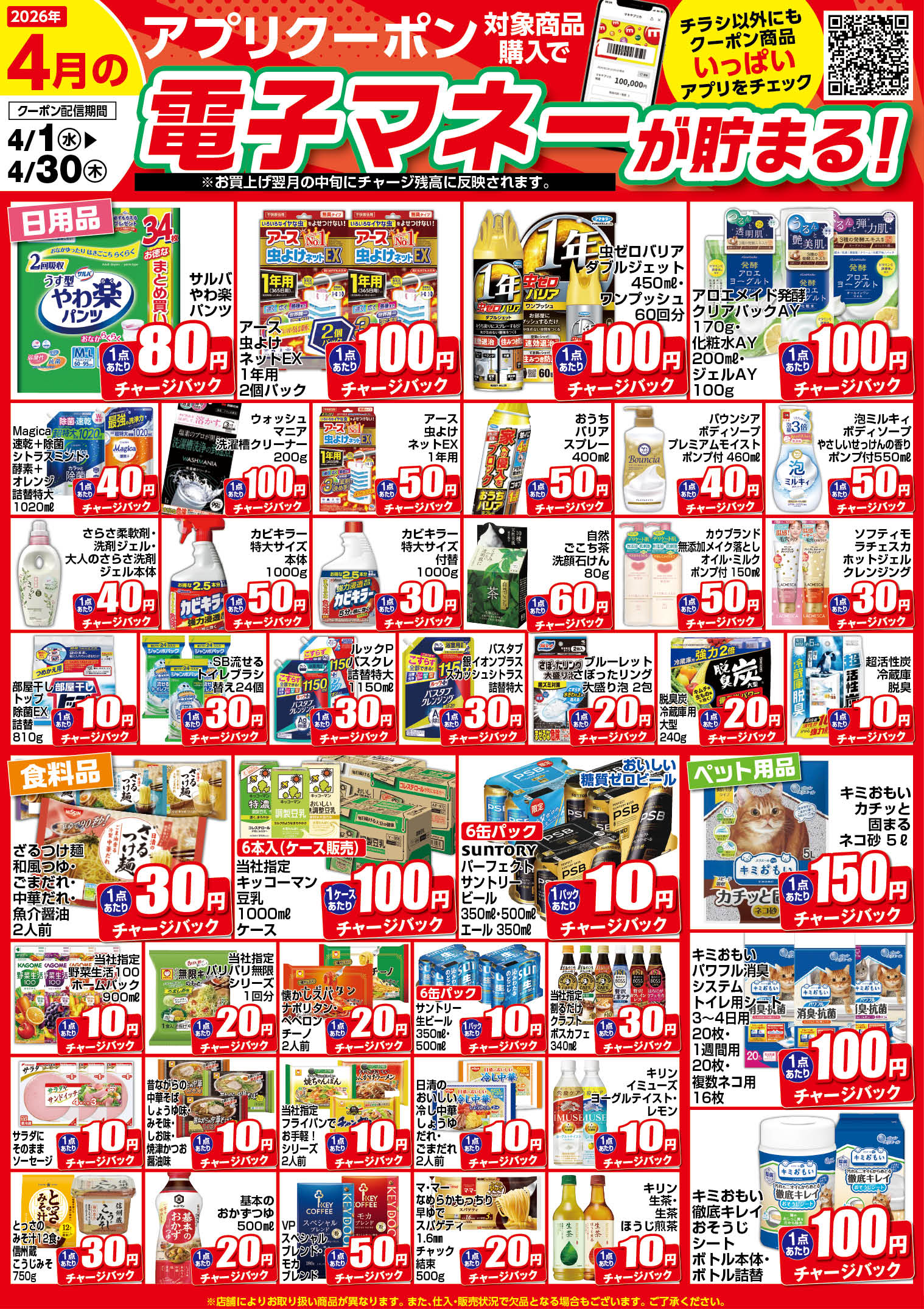 電子マネーが貯まるクーポンを毎月1日に更新!一部の商品をチラシでご紹介しています。まだまだアプリにはオトクがいっぱい、ぜひご確認ください。